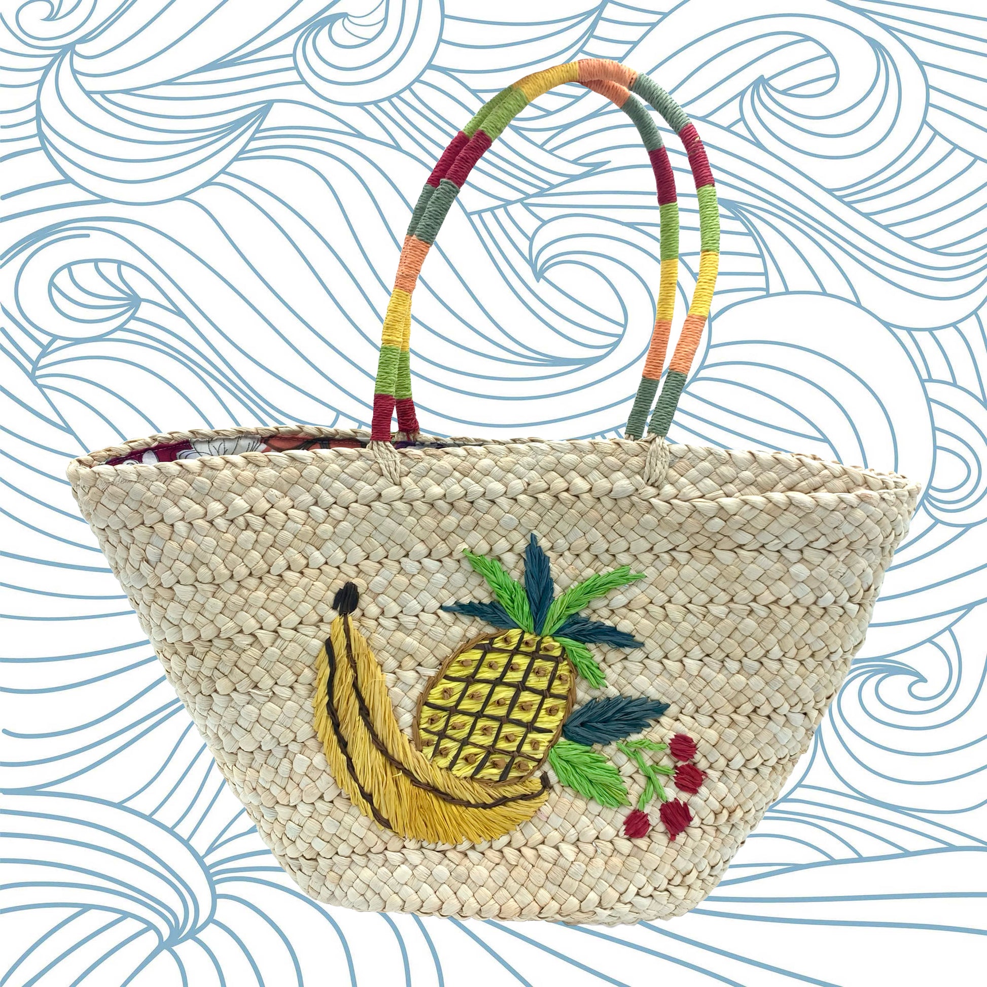 Borsa realizzata in paglia con chiusura a zip, con decorazioni colorate sul lato anteriore e con manici intrecciati e colorati. Molto spaziosa, all’interno è completamente foderata a motivi floreali e presenta una tasca con zip. Molto colorata e originale!