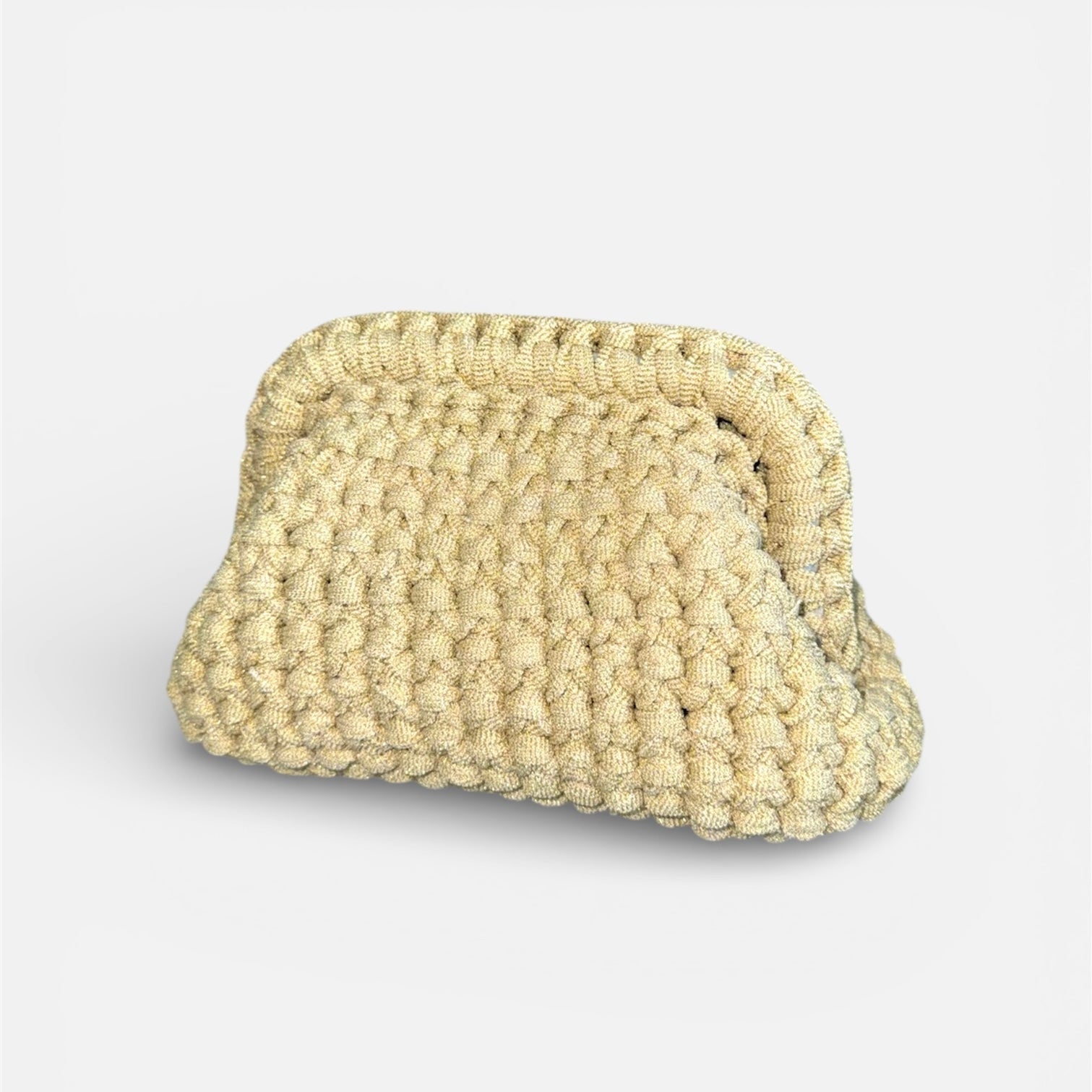 Clutch bag di colore oro, realizzata a mano all’uncinetto con filato lurex, per un elegante effetto luminoso. Un accessorio versatile e di tendenza, perfetto per occasioni serali, eventi speciali o per aggiungere un tocco chic anche agli outfit quotidiani. Compatta ma capiente, è pensata per portare con sé l’essenziale con stile.